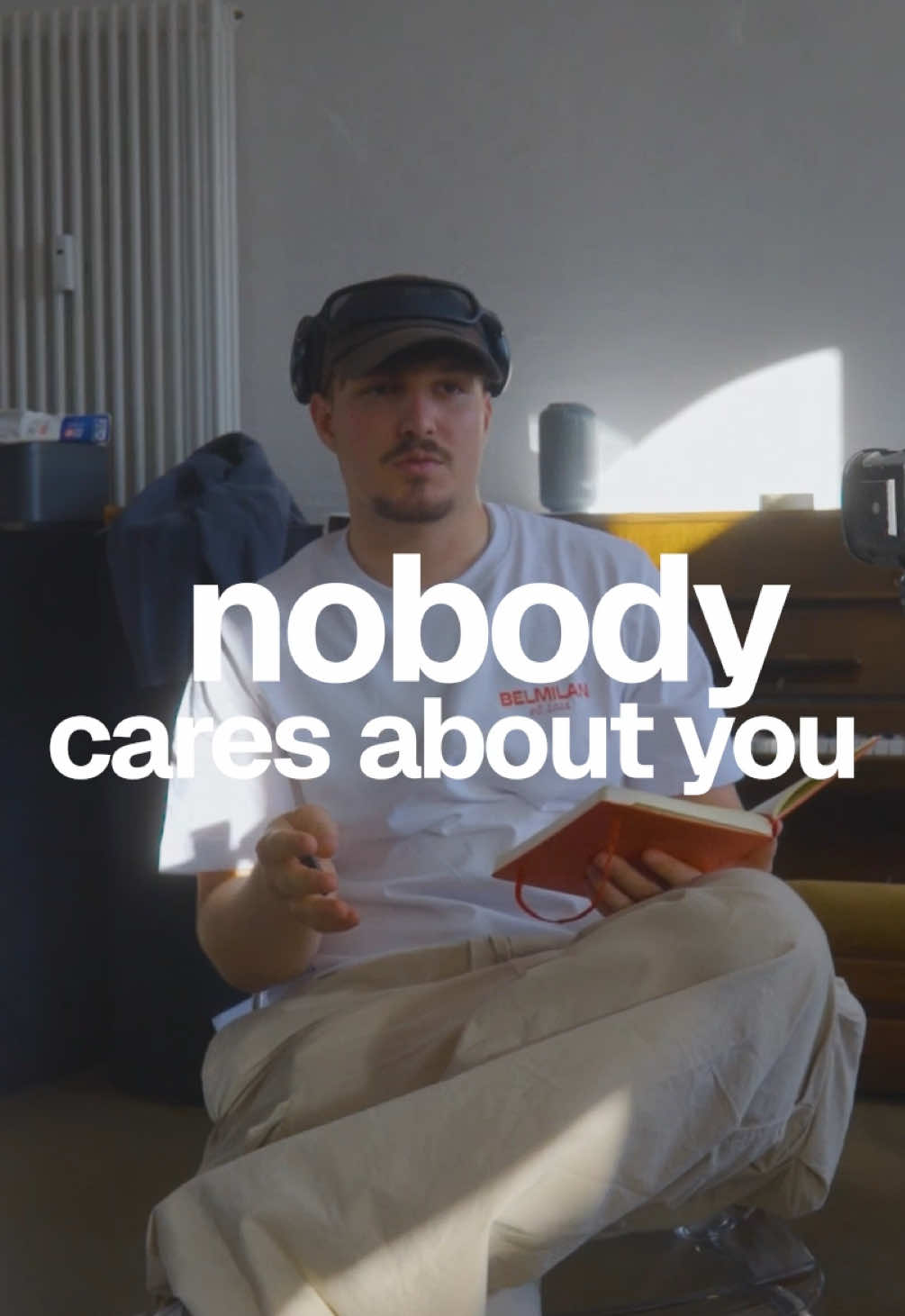 The raw indifference in his expression paired with "nobody cares about you" hits different because it's honest vulnerability disguised as confidence. Founders and creatives see themselves in that moment, and the contrast between the blunt text and his calm presence feels like permission to stop performing.