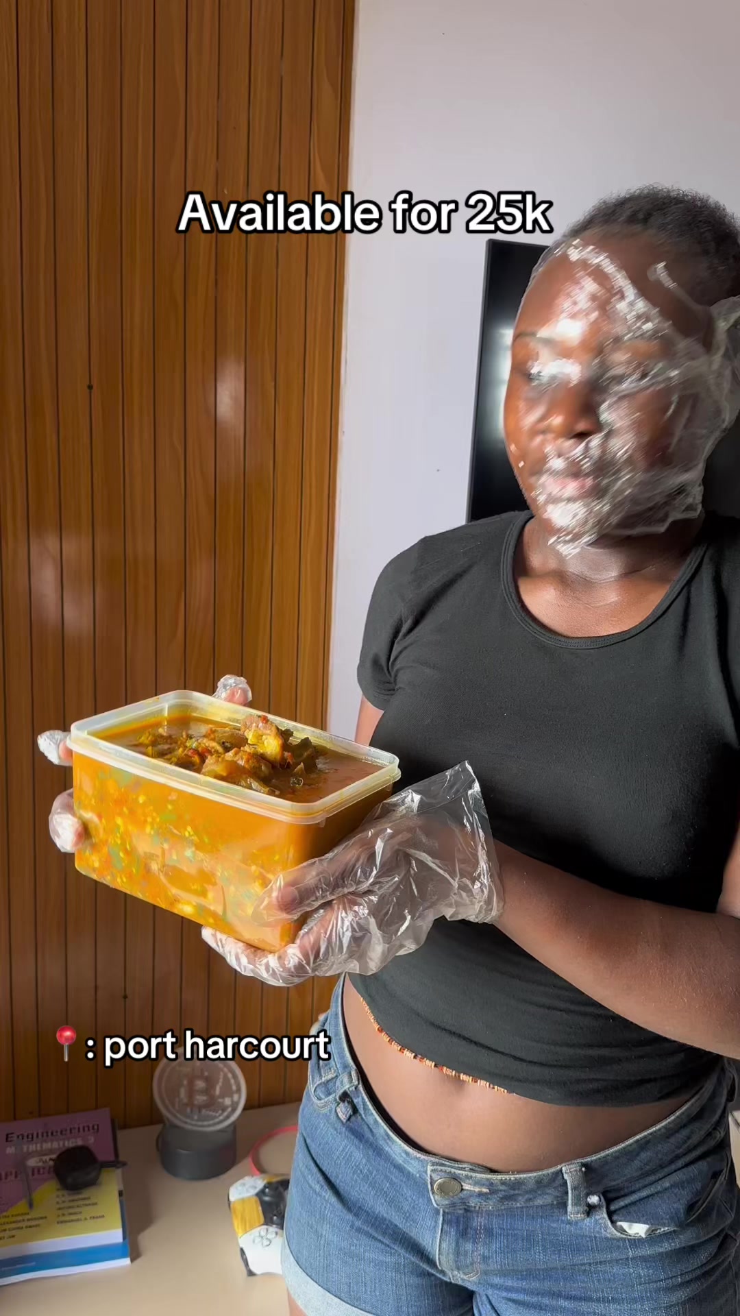The absurdist humor of covering your face with plastic wrap while selling food creates cognitive dissonance that people can't scroll past. It's ridiculous enough to stop the feed, but the price point ("25k") grounds it in real street vendor culture, making the joke land harder because it's rooted in truth.