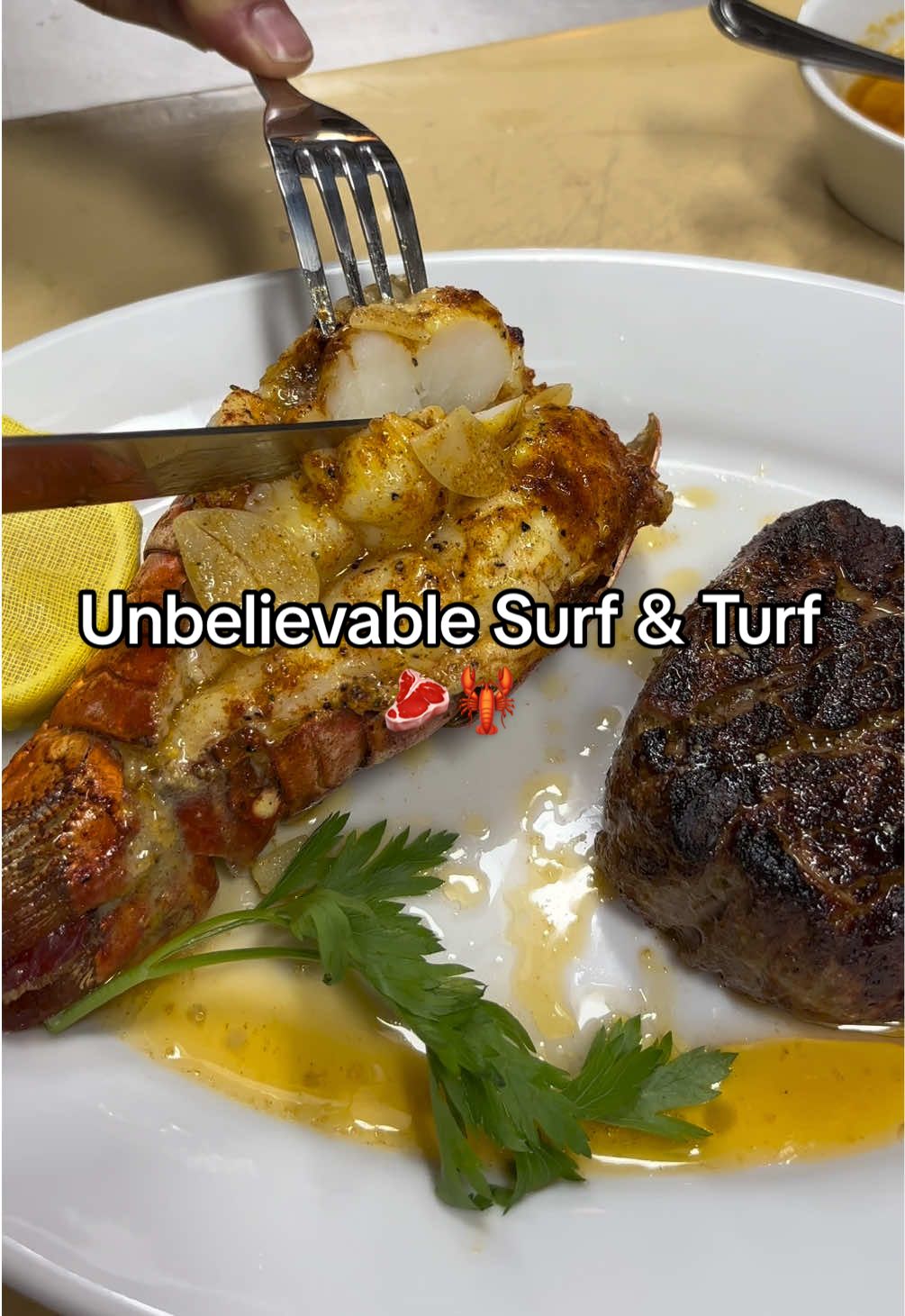 The fork cutting through perfectly cooked lobster tail creates an irresistible textural moment. Close-up food porn paired with aspirational dining taps into both sensory craving and the fantasy of treating yourself.