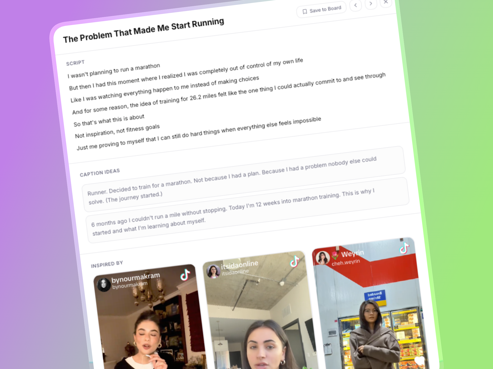 Save posts and generated ideas to boards by client or project. Everything in one place when it's time to plan or pitch.